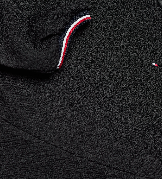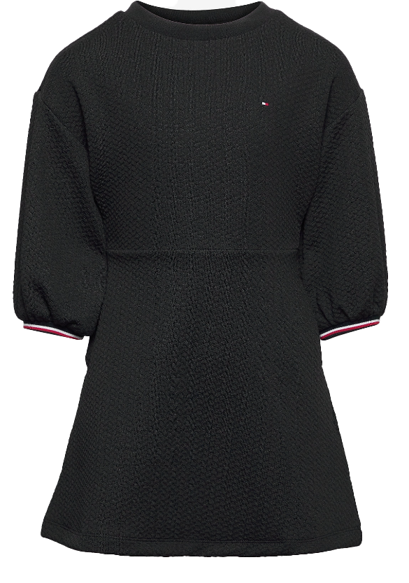 Czarna sukienka z teksturowanej tkaniny ze swobodnymi rękawami wykończonymi ściągaczem w kolorach firmowych marki Tommy Hilfiger.