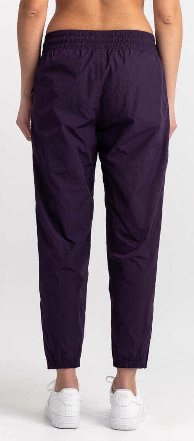 Nylonowe spodnie dresowe i luźne wiatrówki powracają. Te fioletowe spodnie dresowe dla kobiet są tego dowodem. Wykonane jest z nylonu, a podszewka z siatki poliestrowej.