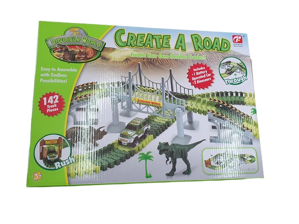 - Zawartość zestawu: 142 elementy (tor elastyczny, samochód, elementy dinozaurów)